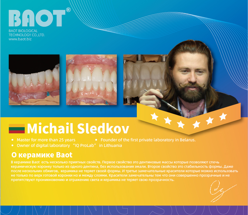 Dans ce cours, le maître M. Michail Sledkov a expliqué les techniques de fonctionnement du BAOT. porcelaine dentaire et blocs de zircone .